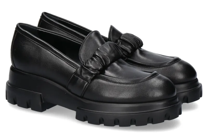 Der schwarze Loafer von AGL ist ein absolutes Fashion-Must-have. Der Schuh aus weichem Leder ist innen ebenfalls mit Leder ausgestattet. Den Loafer ziert ein geraffter Lederriemen. Der Absatz misst 55mm. Den Absatz ziert dezent das Markenbrand. Die Schuhe wurden in Italien gefertigt.