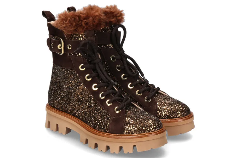 Die Schnürung sorgt nicht nur für eine individuelle Passform, sondern verleiht dem Schuh auch eine sportliche Note. Ein seitlicher Reißverschluss ermöglicht ein einfaches An- und Ausziehen, während die Zierschließe mit goldfarbener Spange auf Höhe der Fessel dem Schuh eine zusätzliche Portion Raffinesse verleiht.