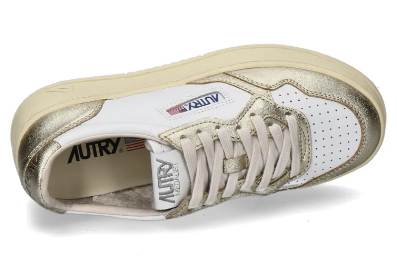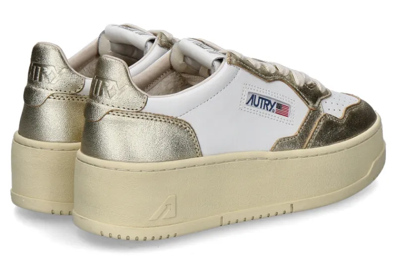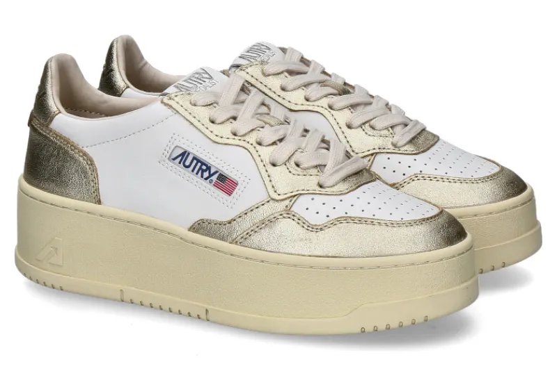 Die Autry Plateausneaker für Damen sind ein stilvolles Statement, gefertigt aus edlem Glattleder in Weiß und Gold. Diese Sneaker kombinieren zeitloses Design mit modernen Akzenten und bieten eine luxuriöse Optik. Die weiche Frotteefütterung im Inneren sorgt für ein angenehmes Tragegefühl, während die wechselbare Lederdecksohle individuelle Anpassungen und zusätzlichen Komfort ermöglicht. Die robuste Gummilaufsohle gewährleistet hervorragende Traktion und Langlebigkeit, ideal für verschiedenste Untergründe. Diese Sneaker sind perfekt für modebewusste Frauen, die Wert auf Qualität und Stil legen. Sie lassen sich vielseitig kombinieren, ob zu lässigen oder sportlichen Outfits, und sind ein Must-have für jede Garderobe.