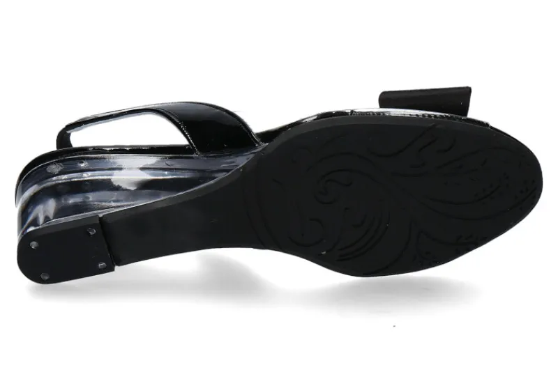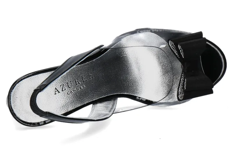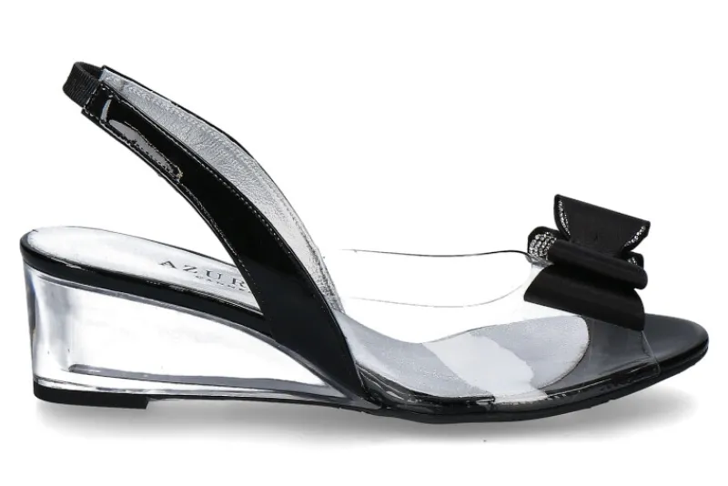 Die Azuree Keilsandale MONY kombiniert moderne Materialien mit glamourösen Details. Gefertigt aus transparentem Vinyl und edlem schwarzem Lackleder, schmiegt sich die Sandale perfekt an den Fuß an und sorgt für einen leichten, nahezu unsichtbaren Look. Im Fokus steht die elegante schwarze Schleife mit funkelnden Strasssteinen, die dem Modell eine feminine und festliche Note verleiht. Der transparente Keilabsatz mit einer Höhe von 45 mm bietet dezenten Komfort und eine stilvolle Silhouette. Die flexible Gummisohle sorgt für sicheren Halt und angenehmes Gehen – auch bei längeren Tragezeiten. Ideal für Sommerabende, elegante Events oder den stilvollen Alltag. MONY ist eine raffinierte Wahl für modebewusste Frauen, die besonderen Wert auf Details und französischen Chic legen.