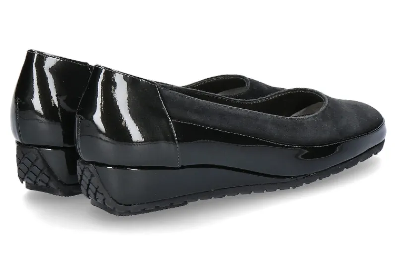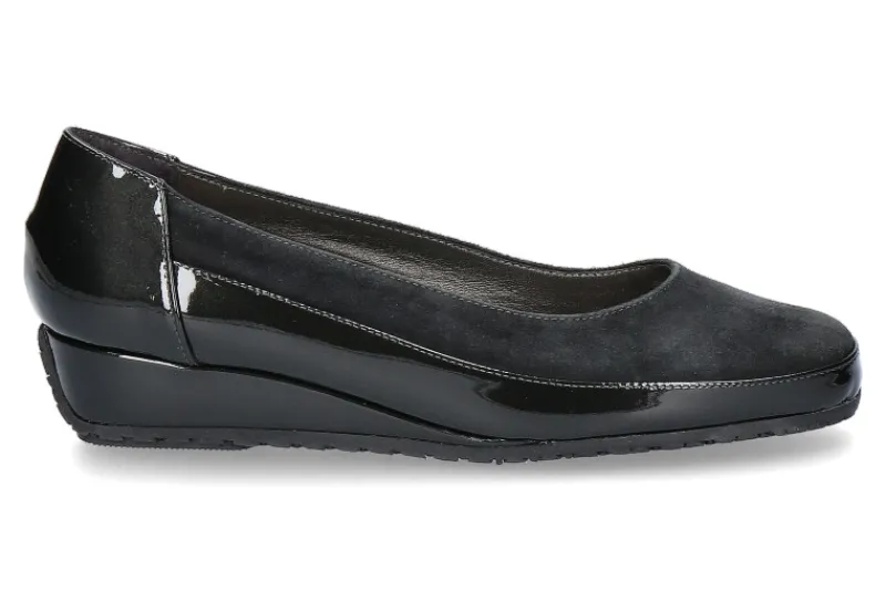 Der Slipper von Bagnoli aus Velours- und Lackleder in grau/schwarz passt perfekt zur Herbst-Winter-Saison! Für den gewohnt guten Tragkomofrt sorgt der bequeme Keilabsatz sowie die sehr gute Leistenform. In Italien gefertigt sind die Bagnoli Schuhe aus hochwertigen Materialien verarbeitet.