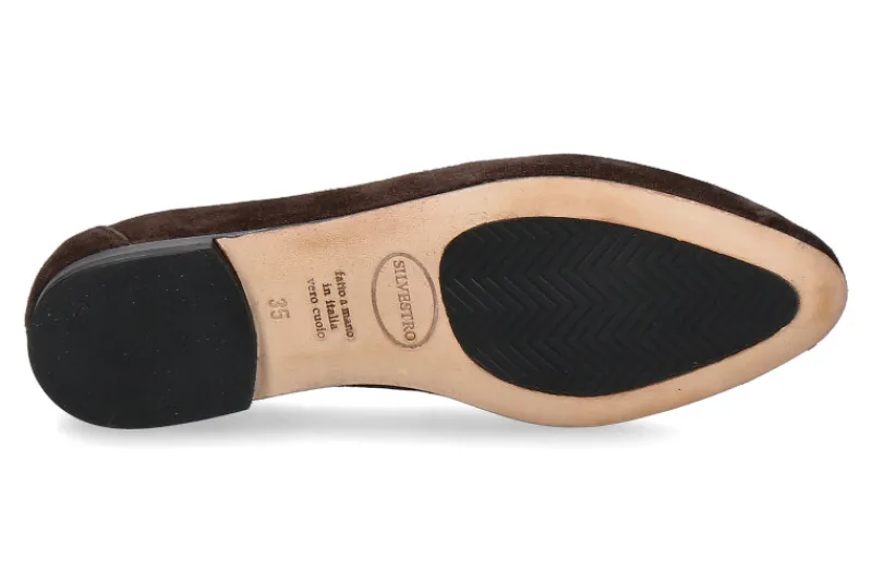 Der dunkelbraune Damenslipper vom italienischen Label Benson´s wurde aus feinem Veloursleder gefertigt. Ausgestattet ist der Schuh mit einer feinen Lederfütterung. Die Laufsohle aus Leder verfügt über einen Gummiteil um besten Tragekomfort zu gewähren. Hergestellt per Handarbeit werden Benson´s Schuhe mit großer Sorgfalt in Italien.