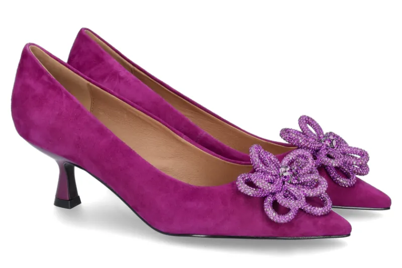 Ein absoluter Hingucker ist der Pumps von Bibi Lou. Mit einer großen Blütenbrosche aus Strasssteinen ziehen Sie garantiert alle Blicke auf sich. Die Pumps sind aus pinkem Nappaleder gefertigt. Der konische Absatz sorgt für einen angenehmen Tragekomfort. Die spitze Schuhform ist top angesagt.