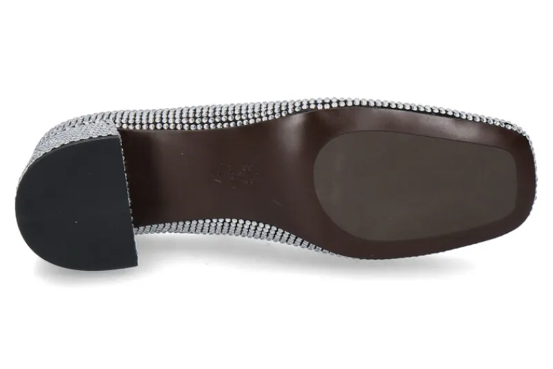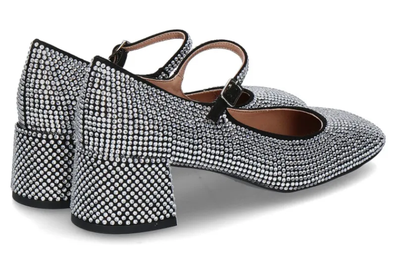 Die Bibi Lou Spangenpumps CARDIFF sind stilvolle und elegante Schuhe, die sich durch ihre hochwertigen Materialien und ihr auffälliges Design bestechen. Das Obermaterial ist mit vielen kleinen, funkelnden Steinen in Silber verziert, die dem Schuh einen luxuriösen und glamourösen Look verleihen. Ein dekorativer Riemen über dem Rist, ausgestattet mit einer praktischen Dornschließe, sorgt für eine optimale Passform und zusätzlichen Halt. Der 50 mm hohe Blockabsatz ist ebenfalls mit funkelnden Steinen bedeckt, was dem Schuh eine harmonische und raffinierte Note verleiht. Die Pumps sind mit einer weichen Lederfütterung ausgestattet, die für hohen Tragekomfort sorgt. Diese Schuhe sind die perfekte Wahl für besondere Anlässe oder glamouröse Auftritte.