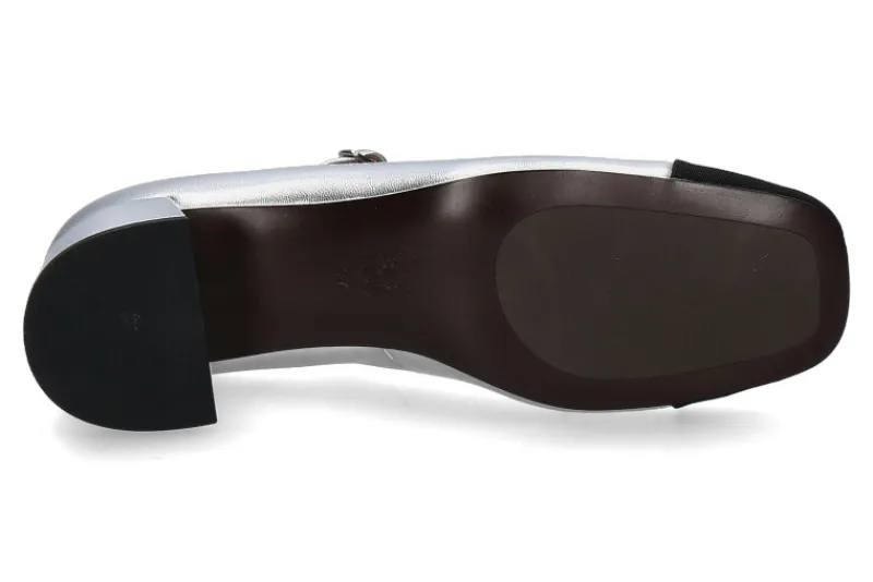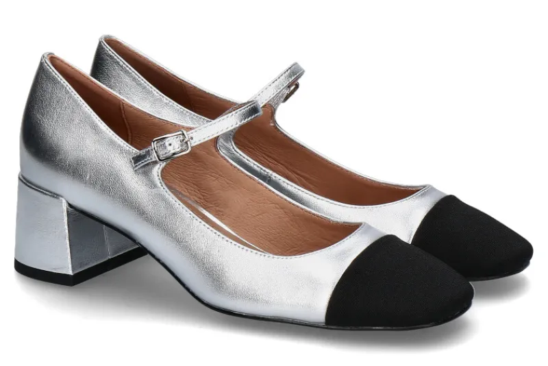 Die Bibi Lou Spangenpumps DANIELLA sind elegante Schuhe aus hochwertigem silberfarbenem Leder, die einen modernen und stilvollen Look verleihen. Ein markanter Akzent ist die schwarze Textilkappe, die den Vorderfuß ziert und für einen spannenden Kontrast sorgt. Über den Rist verläuft ein feiner Riemen, der mit einer klassischen Dornschließe versehen ist, um Halt und eine optimale Passform zu gewährleisten. Der Blockabsatz mit einer Höhe von 50 mm bietet nicht nur ein komfortables Tragegefühl, sondern auch ausreichende Stabilität für den Alltag oder festliche Anlässe. Innen sind die Pumps mit weichem Leder gefüttert, das den Fuß angenehm umschließt und ein luxuriöses Trageerlebnis garantiert. Ein perfekter Begleiter für stilbewusste Frauen!