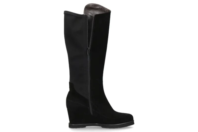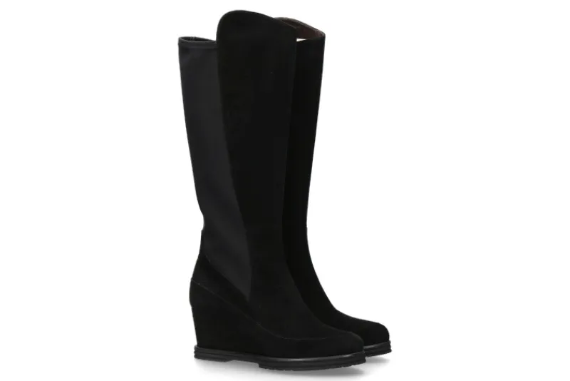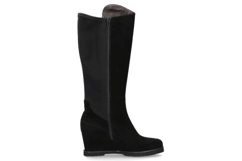 Der zeitlose Brunate Stiefel in schwarz aus feinstem Veloursleder bezaubert durch schlichte Eleganz und ist vielseitig kombinierbar. Feine Nähte verzieren das Obermaterial und unterstreichen die sportlich, elegante Linie. Der Schaftrücken ist aus bestem Stretch gefertigt und ist deshalb sowohl für schlanke als auch festere Waden geeignet. Ausgestattet ist der Schuh mit einem Lederinnenfutter und einer Gummilaufsohle. Der Keilabsatz misst eine Höhe von rund 60 mm. Eine Perfekte Passform sowie eine excellente Verarbeitung zeichnen den Brunate Schuh aus! MADE IN ITALY!