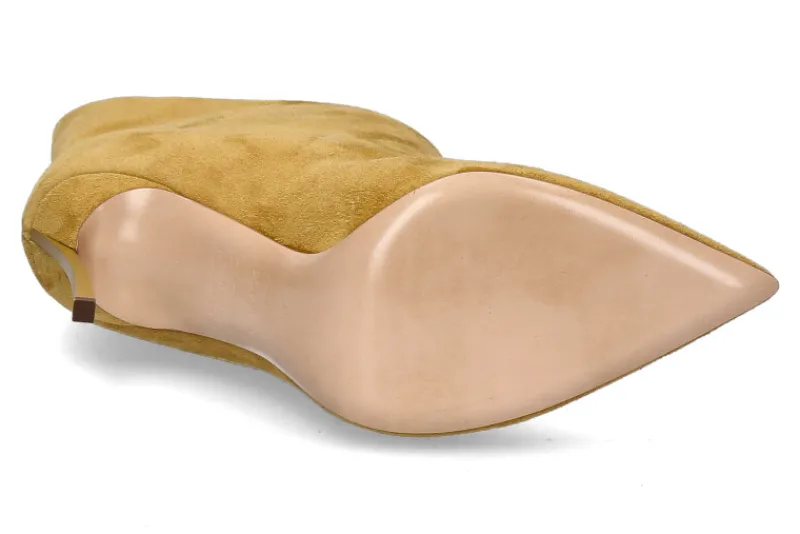 Casadei präsentiert mit diesem Modell ein Highlight der Saison. Aus senffarbenem Veloursleder gefertigt, zaubert der Bootie ein sexy Bein. Der schräge Schnitt des Obermaterials ist ein Blickfang und Extravaganz pur. Abgerundet wird der Highheel durch den 10 mm Absatz ebenfalls in senffarben. Die Stiefelette von Casadei wurde 100% in Italien gefertigt.
