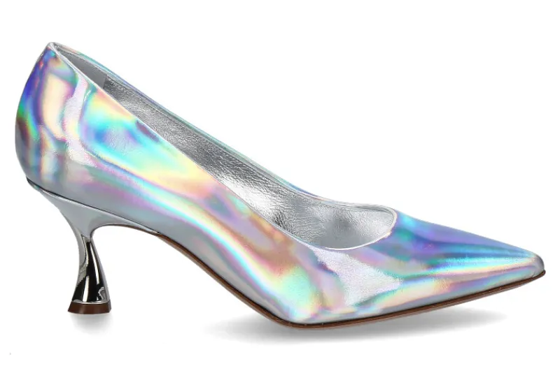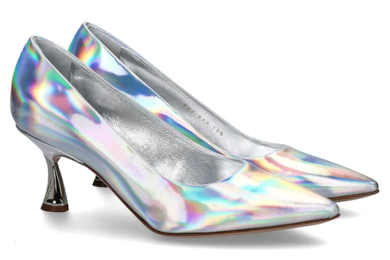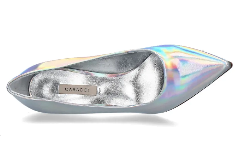 Der Pump OSIRIDE ARGENTO PELLAME von Casadei ist ein echter Blickfang. Dieser Pump wurde aus schillerndem Lackleder gefertigt, das Licht wird auf einzigartige Weise auf dem Lackleder gebrochen, dadurch werden wunderschön leuchtende Farben erzeugt. Die Innensohle und das Innenfutter bestehen aus Silber eingefärbten Leder. Dieser besondere Pump ist perfekt für besondere Anlässe geeignet. Hergestellt werden die Schuhe von Casadei in Italien.