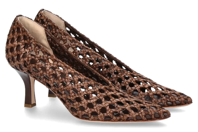 Exklusiv und mit Sicherheit ein Blickfang ist der Casadei Pumps aus dunkelbraunem Flechtleder. Das spitze Modell ist sehr bequem und entzückt durch seine grazil feminine Linie. Abgerundet wird der Pumps mit 60 mm Absatz durch seine polierte Ledersohle. Schuhe von Casadei werden in Italien von Hand gefertigt.