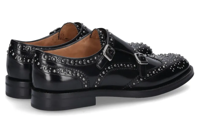 Ein absolutes Must-have ist dieser Schuh von Church’s. Der schwarze Lederschuh ist mit silbernen Nieten verziert, die den Schuh zu einem ganz besonderen Blickfang machen. Die Schuhe sind mit einer Klappe und zwei kleinen Dornschließen versehen. Innen ist der Schuh komplett mit Leder ausgekleidet. Die Laufsohle ist in Leder und Gummi geteilt. Der Schuh wurde bestens in Italien gefertigt.