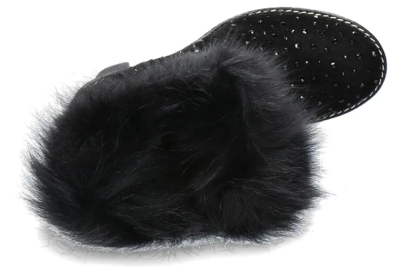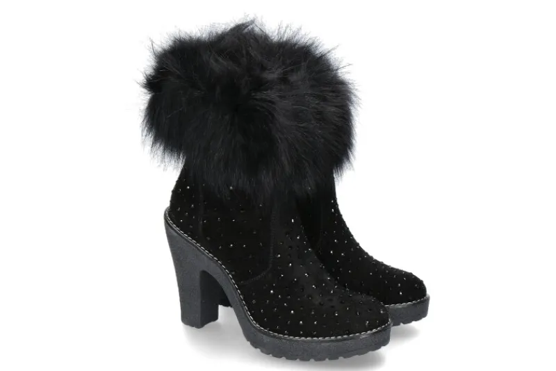 Die Diavolezza Fellstiefelette 851 NERO vereint Eleganz und Komfort in luxuriöser Ausführung. Gefertigt aus edlem schwarzem Veloursleder, wird das Design durch einen Fellrand und funkelnde Swarovski-Steine veredelt, die für einen glamourösen Look sorgen. Der seitliche Reißverschluss ermöglicht ein bequemes An- und Ausziehen. Mit einem stabilen 11 cm hohen Absatz hebt die Stiefelette die Silhouette und bleibt durch die Gummilaufsohle mit Profil auch auf winterlichen Untergründen rutschfest. Das warme Innenfutter garantiert angenehmen Tragekomfort, selbst an kalten Tagen. Diese Stiefelette ist die perfekte Wahl für modebewusste Frauen, die Stil und Funktionalität kombinieren möchten. Ein exklusiver Begleiter, der jedem Outfit einen Hauch von Luxus verleiht.