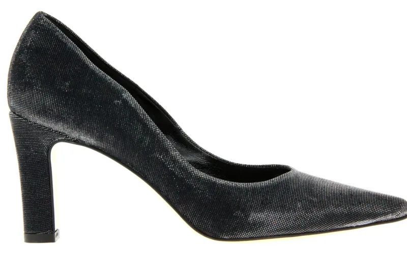 Der spitze Pumps SVEVA von Donna Più glänzt in schwarz-silber. Verleihen Sie Ihrem Outfit mit diesem Pumps einen letzten Schliff! Innen wurde der Schuh mit Leder ausgekleidet. Die Laufsohle besteht ebenfalls aus beigem Leder. Der rund 75 mm Hohe Absatz wurde ebenfalls aus Synthetik in schwarz-silber überzogen. Gefertigt werden Modelle von Donna Più mit einer guten Verarbeitung in Italien hergestellt. Größenhinweis: Dieses Modell fällt etwas kleiner aus!