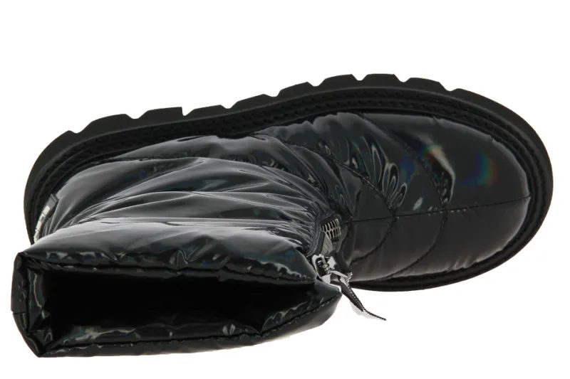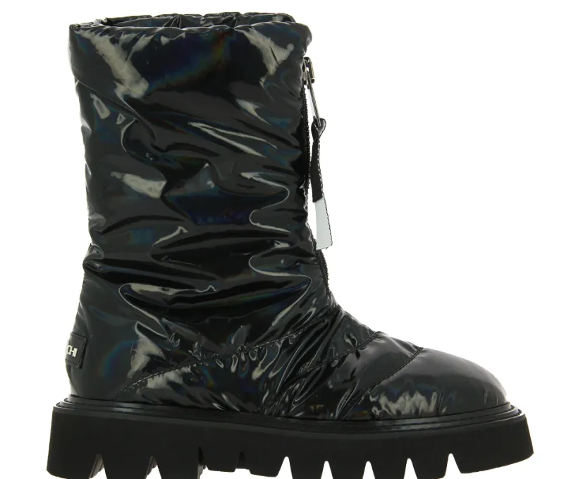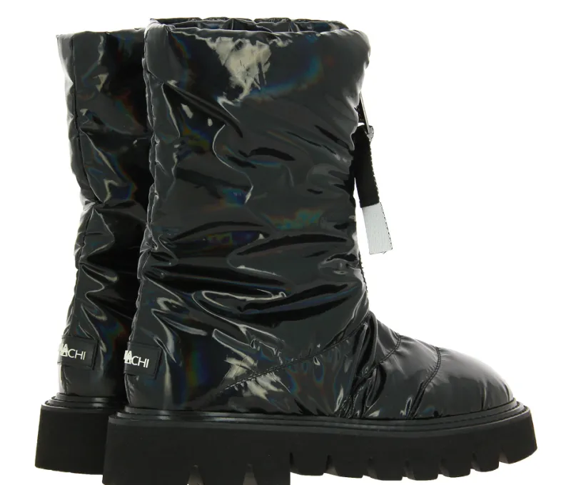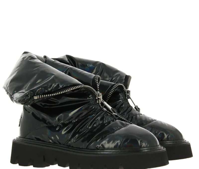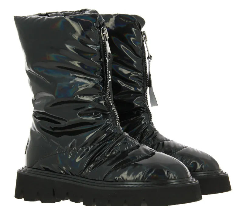 Ein Blickfang und stylisch ist der neue Boots von Elena Iachi ganz im voluminösen Stil in schwarz mit Rainbow-Glanz. Griffig und robust ist die Gummisohle, die den Look des Schuhs komplettiert. Innen ist das Modell mit Leder gefüttert. Durch den Zip kann der Boots in unterschiedlichen Varianten getragen werden: Geöffnet und umgeschlagen oder geschlossen. Gefertigt werden Schuhe von Elena Iachi zu 100% in Italien.