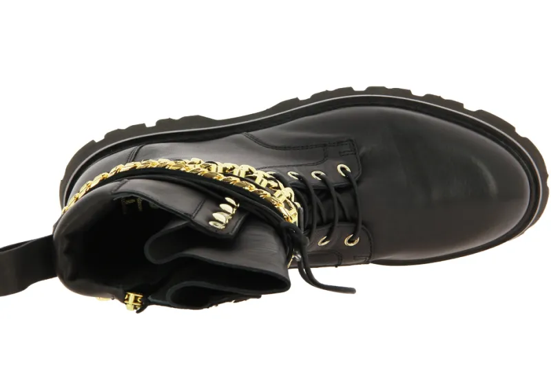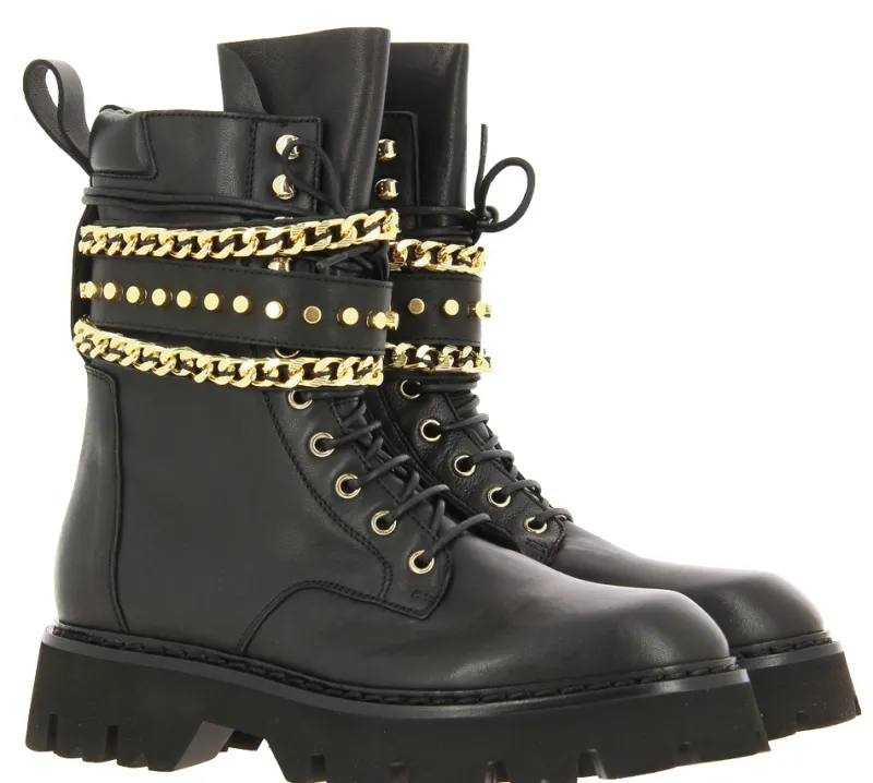 Extravaganz pur verspricht der Fru.it Boots aus bestem weichen Leder in Schwarz mit goldenen Details. Durch seine Schnürung lässt sich das Modell individuell anpassen und der Einschlupf ist durch den Reißverschluss an der Seite kinderleicht. Leicht und flexibel ist die Laufsohle, die zum hohen Komfort des Combat-Boots beiträgt. Das goldene Kettenaccessoire lässt sich durch Druckknöpfe entfernen. Hergestellt werden Schuhe von Fru.it zu 100% mit Liebe zum Detail in Italien.