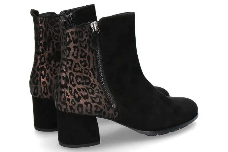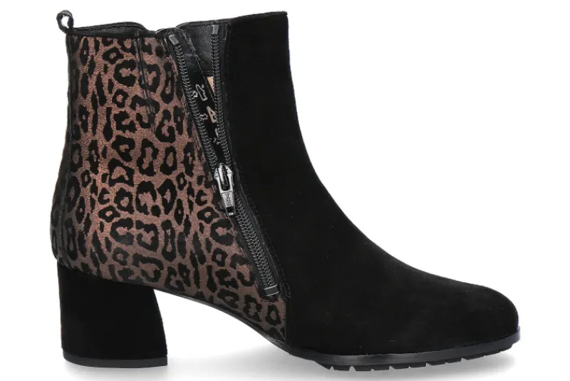 Die Hassia Stiefelette wurde aus feinem Veloursleder in schwarz gefertigt. Eine Besonderheit ist der Schaftrücken in bronzefarben Leo-Look. Das Model verfügt über zwei Reißverschlüsse die ein leichtes An- und Ausziehen gewähren. Zudem verfügt der Schuh über eine Lederfütterung und einer rutschfesten Gummilaufsohle. Der Absatz misst eine höhe von ca. 55 mm. Hergestellt wurde die Hassia Stiefelette in Deutschland.