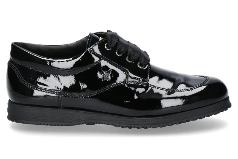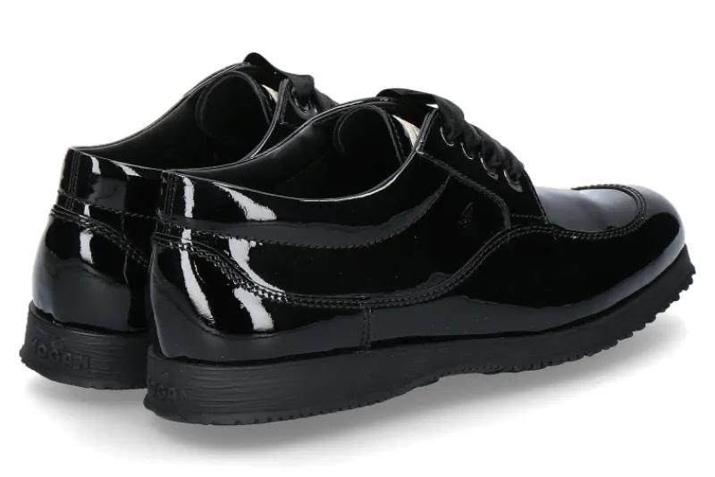 Der Hogan Damenschnürer wurde aus feinem Lackleder in schwarz gefertigt. Seidenschnürsenkel runden den Gesamtlook gekonnt ab. Das Innenfutter sowie die Decksohle sind aus feinem Glattleder gefertigt. Die Decksohle ist zudem wechselbar. Hergestellt mit einer rutschfesten Gummilaufsohle wurde der Hogan Damenschuh bestens in Italien.