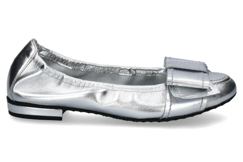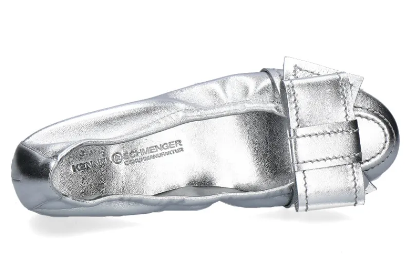 Der Kennel & Schmenger Ballerina präsentiert sich in strahlendem silbernen Nappaleder und beeindruckt mit einer auffälligen, großen Lederschleife, die dem Schuh einen femininen und zugleich modernen Look verleiht. Ein seitlich eingefasster Gummizug gewährleistet eine bequeme Passform und erleichtert das An- und Ausziehen. Die griffige Gummisohle sorgt für einen sicheren Tritt und macht den Ballerina alltagstauglich. Die hochwertige Verarbeitung zeigt sich auch in der Lederinnensohle, die zusätzlichen Komfort bietet. Dieser Ballerina von Kennel & Schmenger vereint stilvolles Design mit praktischen Eigenschaften, was ihn zu einer perfekten Wahl für Damen macht, die Eleganz und Bequemlichkeit schätzen.