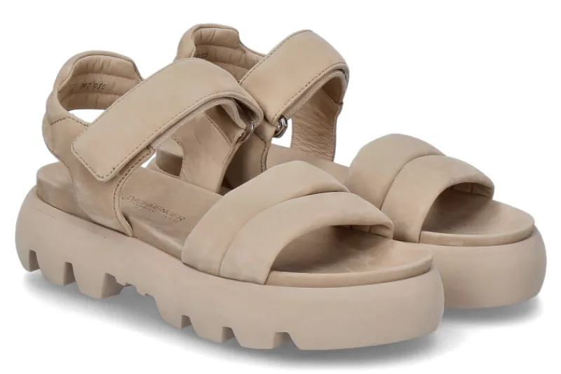 Die schlichte, aber dennoch modische beige Sandale aus weichem Nubuk-Leder ist ein richtiges Allroundtalent. Die vorgeformte Innensohle aus Leder schafft einen angenehmen Tragekomfort. Die Lederriemen sind gepolstert und schmiegen dem Fuß optimal an. Der Klettverschluss ermöglicht Ihnen einen leichten und schnellen Einschlupf. Die Plateau-Sohle in beige rundet den trendigen Look perfekt ab.