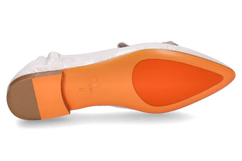Die Damen-Slipper von Kroll präsentieren sich in einem eleganten hellgrauen Lackleder. Die Fransenlasche verleiht dem Schuh eine subtile Raffinesse, während die Sacchetto-Machart für herausragenden Tragekomfort steht. Die Ledersohle ist mit einem auffälligen orangefarbenen Gummieinsatz ausgestattet, der nicht nur ein modisches Element darstellt, sondern auch für eine rutschfeste Lauffläche sorgt. Jedes Paar wird mit präziser Handwerkskunst in Italien gefertigt, was für höchste Qualität und exklusiven Stil steht. Die Kombination aus dezentem hellgrauem Lackleder, innovativem Design und traditioneller Herstellung macht diese Slipper zu einem einzigartigen und stilvollen Statement für Damen, das die Eleganz von Made in Italy verkörpert.