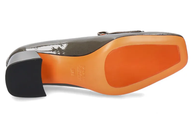 Der Trotteur mit Haferllasche aus grauem Lackleder ist ein stilvoller und eleganter Schuh für besondere Anlässe. Der 50 mm hohe Blockabsatz sorgt für einen stabilen und bequemen Stand, während die Karee-Form dem Schuh eine moderne und markante Silhouette verleiht. Die Ledersohle mit Gummieinsatz bietet zusätzlichen Halt und Langlebigkeit, ideal für längeres Tragen. Im Inneren sorgt das orangefarbene Lederfutter für einen auffälligen Kontrast und ein luxuriöses Tragegefühl. Dieser Schuh ist eine perfekte Kombination aus klassischem Design und modernen Details, ideal für die modebewusste Frau, die Wert auf Qualität und Stil legt. Perfekt kombinierbar mit verschiedenen Outfits, verleiht er jedem Look einen Hauch von Eleganz und Raffinesse.
