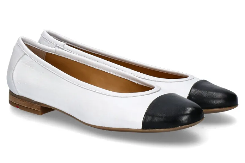 Die Lloyd Ballerinas FREYA aus weißem Leder mit einer schwarzen Lederspitze präsentieren sich in einer eleganten Schicht-Optik. Die Schchetto-Machart verleiht ihnen eine besondere Raffinesse. Mit ihrer runden Form und der strapazierfähigen Gummisohle bieten sie nicht nur einen stilvollen Look, sondern auch hohen Tragekomfort und optimale Griffigkeit. Diese Ballerinas sind vielseitig kombinierbar und eignen sich perfekt für den Alltag sowie für besondere Anlässe. Jedes Paar wird mit Liebe zum Detail gefertigt, um höchste Qualität sicherzustellen. Die Kombination aus edlem Design und erstklassigem Material macht diese Ballerinas zu einem zeitlosen Klassiker in jeder Damengarderobe. Entdecken Sie Luxus und Komfort mit den exquisiten Lloyd Ballerinas.