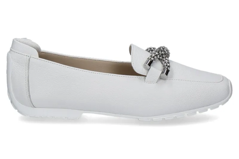 Der Mania Slipper aus weißem Leder überzeugt mit schlichter Eleganz und einem Hauch von Glamour. Die funkelnde Strassapplikation auf der Front verleiht dem Schuh einen edlen, modernen Akzent und macht ihn zum Highlight jedes Outfits. Ausgestattet mit weichem Lederinnenfutter und einer gepolsterten Lederinnensohle bietet der Slipper erstklassigen Tragekomfort und optimale Atmungsaktivität. Die weiße Procar-Gummisohle sorgt für Flexibilität, Rutschfestigkeit und Stabilität, während sie gleichzeitig die hochwertige Verarbeitung unterstreicht. Dieser Slipper ist vielseitig einsetzbar und eignet sich perfekt für besondere Anlässe oder stilvolle Alltagslooks. Made in Portugal, steht er für herausragende Handwerkskunst und langlebige Qualität. Ein eleganter Begleiter für Damen mit einem Faible für Komfort und Stil.