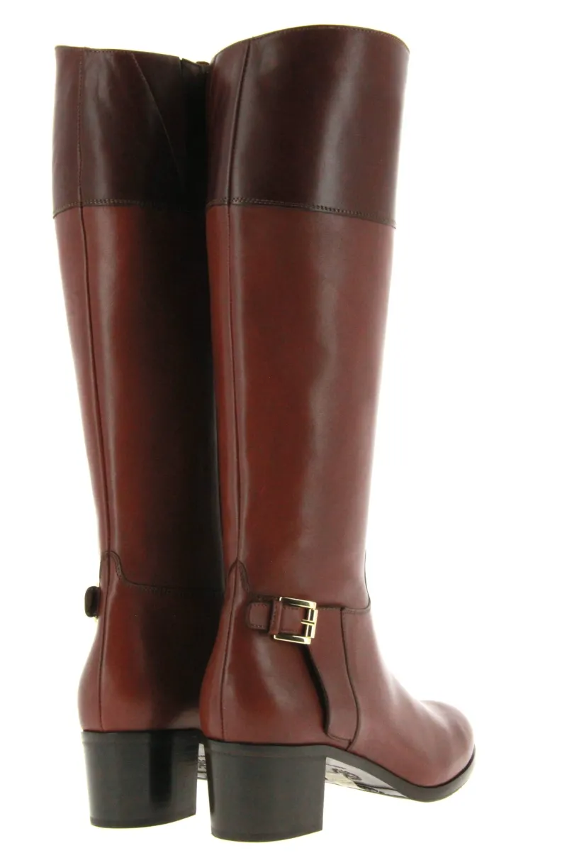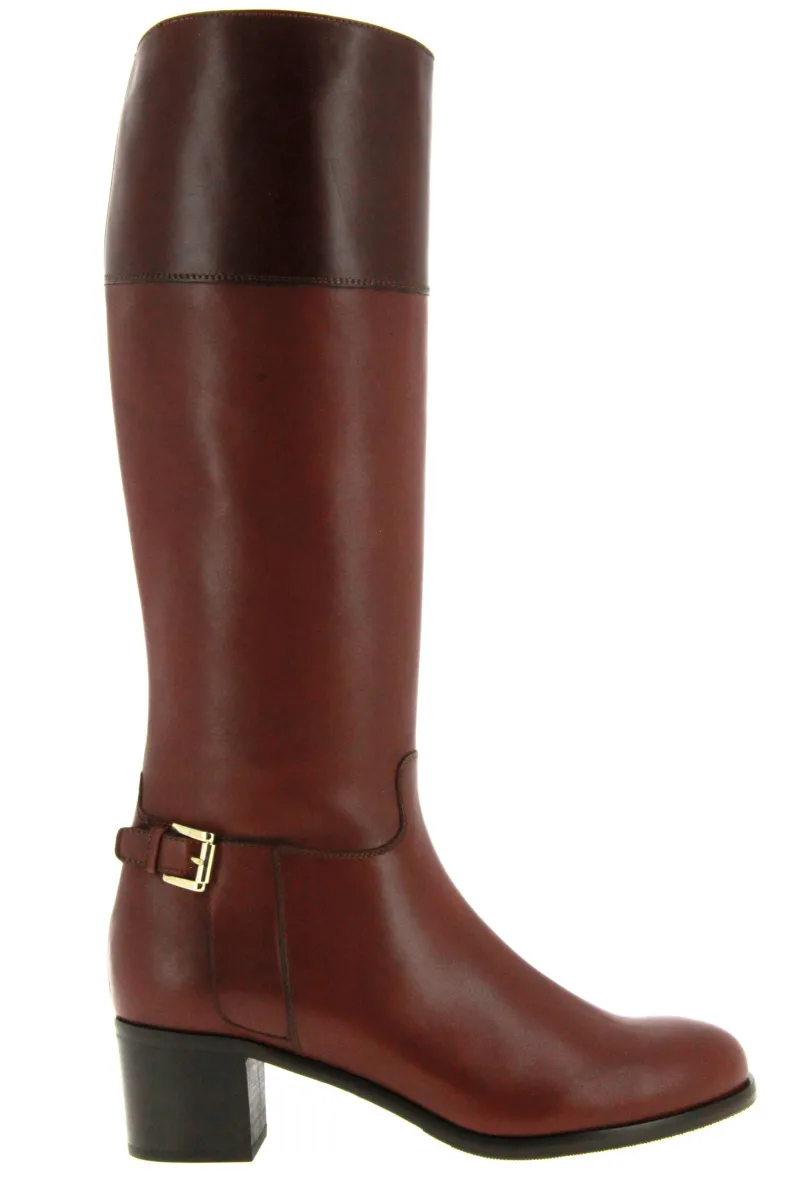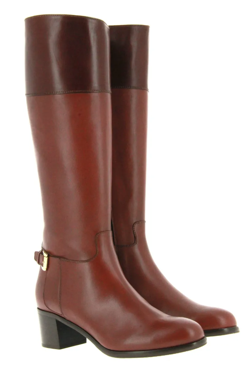 Der braune Stiefel von Maretto ist aus weichem Lammleder gefertigt. Er ist ein klassischer Stiefel mit einem farblichen Akzent. Das Obermaterial des Stiefels hat zwei braun Töne. Die goldfarbene Schnalle über der Ferse wertet den Schuh optisch auf. Der Absatz beträgt ca. 40 mm. Die Schaftlänge beträgt ca. 40 cm, Schaftweite ca. 38 cm, gemessen bei Gr. 37