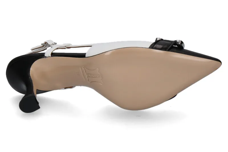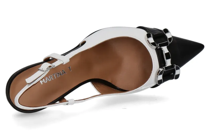 Die Martina T Slingpumps aus weißem Leder präsentieren sich mit einer eleganten schwarzen Spitze und einem weißen, schwarzen Accessoire für einen zeitlosen Kontrast. Das spitze Modell verleiht diesen Schuhen eine raffinierte Note. Mit einer Ledersohle und einem 70 mm Absatz bieten sie nicht nur Stil, sondern auch Komfort. Eine seitliche Dornschließe ermöglicht eine individuelle Anpassung für optimalen Halt. Diese Schuhe verkörpern Eleganz und Klasse und sind perfekt für verschiedene Anlässe geeignet. Jedes Paar wird mit höchster Handwerkskunst in Italien gefertigt, um die herausragende Qualität sicherzustellen, für die Martina T bekannt ist. Erleben Sie Luxus und Stil mit den exquisiten Martina T Slingpumps aus weißem Leder mit schwarzer Spitze und weiß-schwarzem Accessoire.