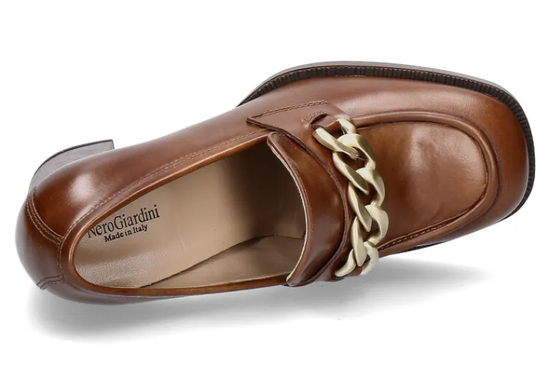 Nero Giardini präsentiert den stilvollen Trotteur mit hochwertigem Ledermaterial und einer bequemen Innensohle aus Leder. Dieser elegante Schuh besticht durch eine auffällige goldene Kette als Verzierung, die dem Design eine luxuriöse Note verleiht. Der Blockabsatz sorgt für optimalen Tragekomfort und bietet zugleich eine modische Silhouette. Mit seiner gelungenen Kombination aus Eleganz und Komfort ist dieser Trotteur perfekt für jede Gelegenheit, sei es im Büro, bei besonderen Anlässen oder für den Alltag. Nero Giardini präsentiert damit erneut ein exquisites Schuhwerk, das höchsten Ansprüchen gerecht wird und jeden Look auf stilvolle Weise abrundet.