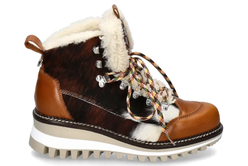 Die New Italia Shoes Boots ERIKA sind stilvolle, wintertaugliche Stiefel aus hochwertigem Rindsleder in Braun und Weiß, veredelt mit Rindshaar-Details für eine besondere Optik. Am Obermaterial setzen weiche Lammfell-Details zusätzliche Akzente, die nicht nur modisch, sondern auch wärmend sind. Die Schnürsenkel werden durch robuste, silberne Ösen geführt, während braune Glattlederdetails dem Design eine edle Note verleihen. Die sportive, profilierte Gummisohle bietet optimalen Halt auf verschiedenen Untergründen, ideal für winterliche Bedingungen. Innen sind die Boots mit einer Kombination aus wärmendem Webpelz, Lammfell und Schurwolle gefüttert, was für angenehmen Tragekomfort und hervorragende Isolation sorgt. Diese Boots vereinen Funktionalität und modischen Anspruch perfekt.