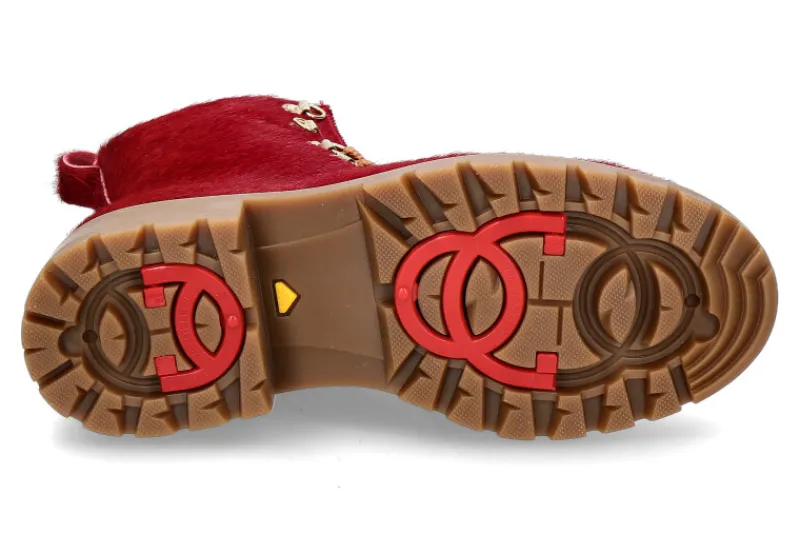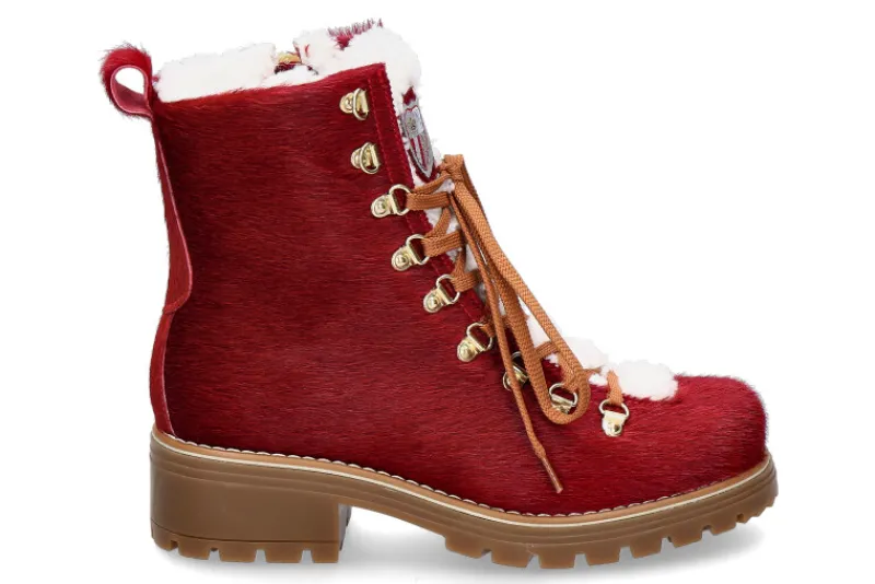 Die New Italia Boots aus rotem Kuhfell sind ein auffälliges und modisches Statement für diejenigen, die Individualität und Stil schätzen. Mit einer robusten Bergsteigerschnürung, die durch goldfarbene Ösen ergänzt wird, verleihen sie jedem Outfit einen Hauch von Raffinesse und Abenteuer. Die weiße Zunge aus gelocktem Lammfell setzt einen markanten Kontrast zum roten Kuhfell und verleiht den Stiefeln einen edlen Touch. Ihr Inneres ist mit Lammfell und Webpelz gefüttert, was nicht nur ein luxuriöses Gefühl bietet, sondern auch für außergewöhnliche Wärme und Gemütlichkeit sorgt. Diese Stiefel sind die perfekte Wahl für kalte Tage, da sie nicht nur stilvoll, sondern auch funktional sind. Sie vereinen Mode und Komfort auf beeindruckende Weise und sind ideal für diejenigen, die auffallen und gleichzeitig warm und bequem bleiben möchten.