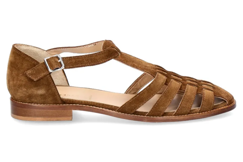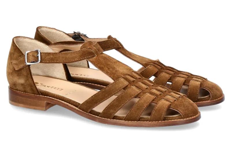 Die Römersandale von Pascucci wurde aus braunem Veloursleder gefertigt. Die schmalen Riemen versprechen einen guten und stabilen Halt im Schuh. Die angebrachte, silberne Schließe lässt sich individuell verstellen. Ausgestattet ist das Modell zudem mit einer Lederfütterung und Laufsohle. MADE IN ITALY!