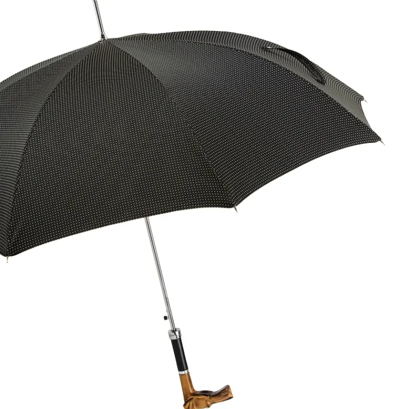 Mit diesem handgefertigten Regensschirm aus dem Hause Pasotti haben Sie mit Sicherheit auch bei schlechtem Wetter gute Laune. Hochwertiger Stoff aus 100% Polyester sowie ein automatischer Öffner verleihen Exklusivität, die Moderne und Tradition verknüpfen. Der Griff dieses Kunstwerks wurde handgeschnitzt. Die Länge des Schirms beträgt ca. 95 cm, der Durchmesser 110cm. Gefertigt werden Schirme von der Manufaktur Pasotti zu 100% in Italien.