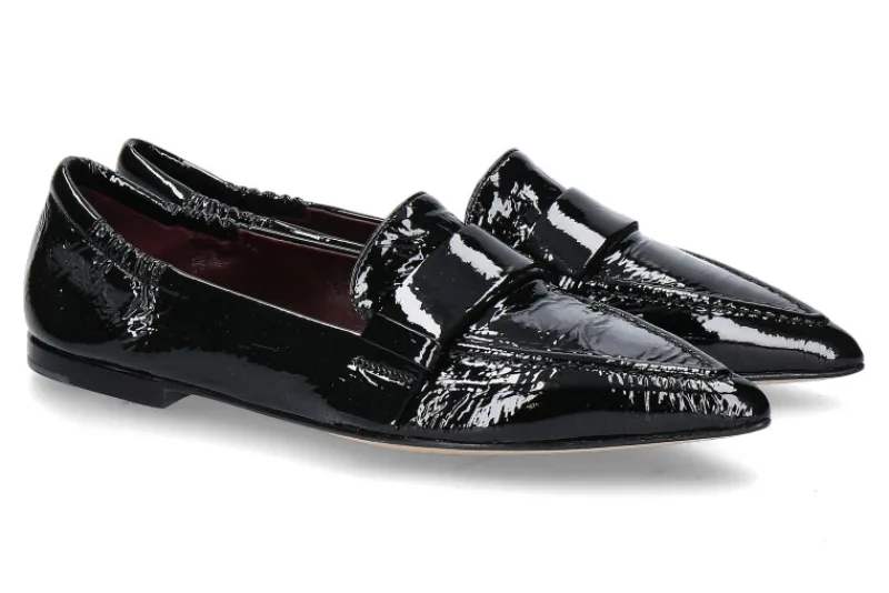 Die Pomme d’Or Slipper aus schwarzem Lackleder sind eine stilvolle und bequeme Wahl für den Alltag. Sie zeichnen sich durch ihre spitze Schuhkappe aus, die ihnen eine elegante Note verleiht. Der Gummizug im Fersenbereich sorgt für eine optimale Passform und erleichtert das An- und Ausziehen. Die weich gepolsterte Lederfütterung bietet hohen Tragekomfort, während die Kombination aus Leder- und Gummilaufsohle für Flexibilität und Haltbarkeit sorgt. Diese Slipper sind ideal für Frauen, die Wert auf modisches Design und Komfort legen. Perfekt für verschiedene Gelegenheiten, von Büro bis Freizeit, kombinieren sie Funktionalität und Stil auf hervorragende Weise.
