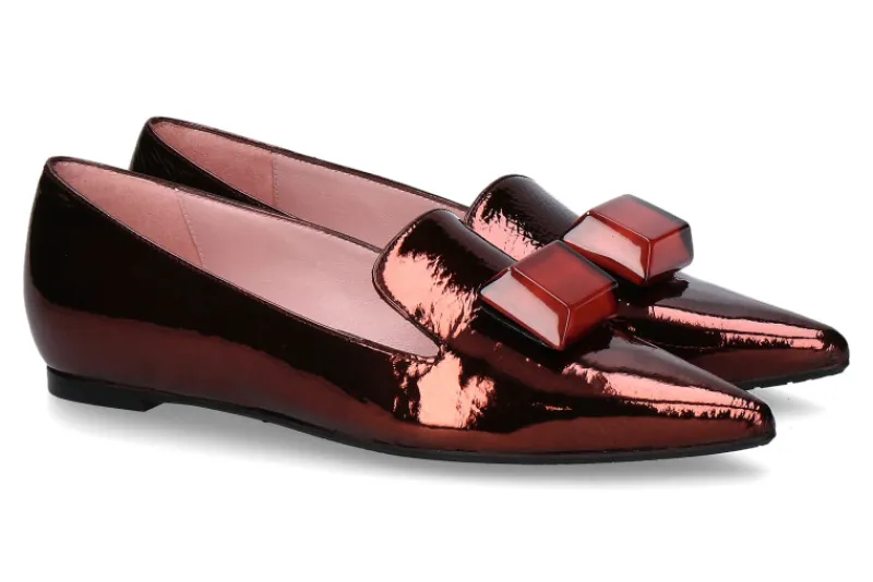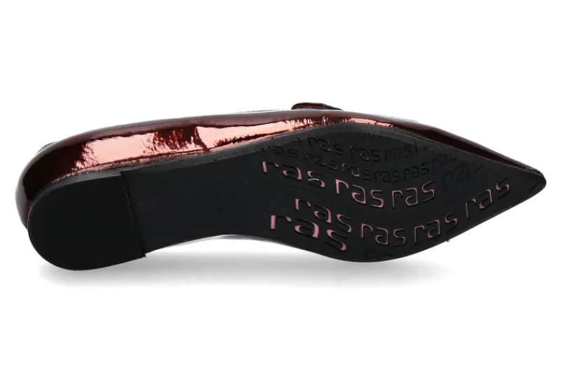 Der weinrote Loafer von RAS, hergestellt in Spanien, ist aus geckracktem Lackleder gefertigt und strahlt einen Hauch von Raffinesse aus. Mit seiner spitzen Form verleiht er jedem Outfit eine elegante Note. Ein auffälliges Detail ist das rechteckige Accessoire in rubinroter Farbe auf der Vorderseite, das dem Schuh einen Hauch von Glamour verleiht. Sowohl die Lederinnensohle als auch das Lederinnenfutter sorgen für höchsten Komfort und Atmungsaktivität. Die Gummisohle bietet Traktion und Langlebigkeit. Jedes Paar dieser Loafer reflektiert die traditionelle Handwerkskunst und das Engagement für Qualität, für das RAS bekannt ist. Der weinrote Loafer von RAS ist die perfekte Wahl für anspruchsvolle Frauen, die nach einem stilvollen Schuh suchen, der Komfort und Eleganz vereint. Er ergänzt sowohl formale als auch lässige Outfits mit einem Hauch von Exklusivität.