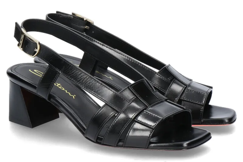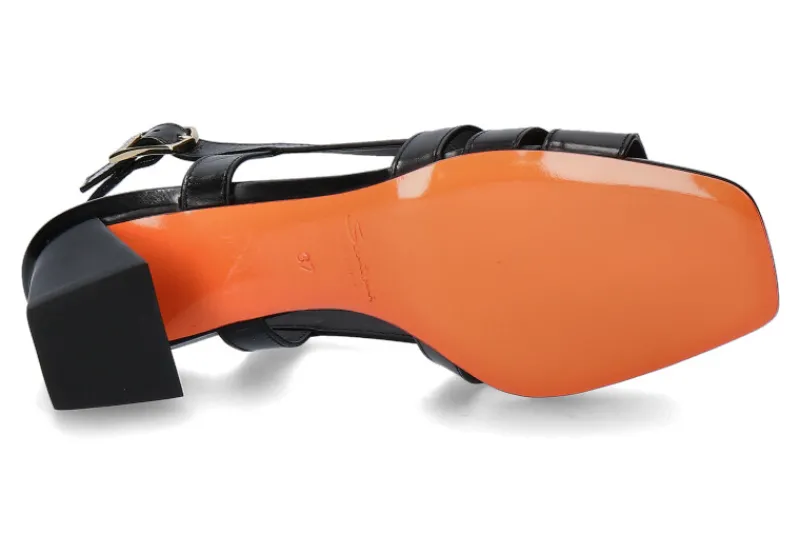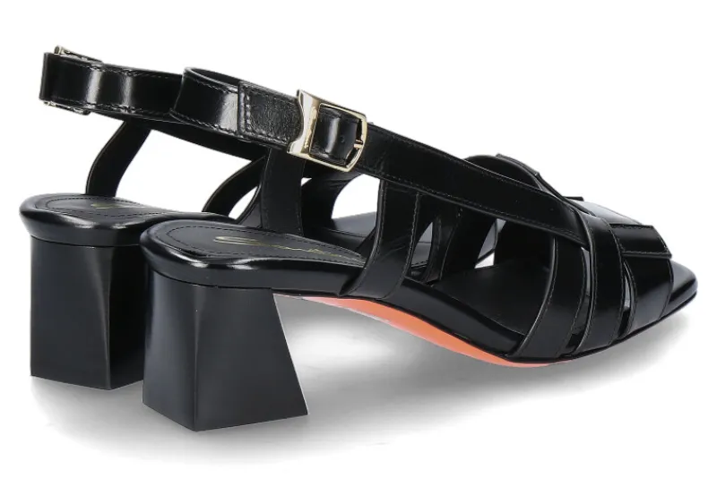 Die Santoni Damen-Sandale präsentiert sich in zeitloser Eleganz mit schwarzem geflochtenem Leder, das Raffinesse und Vielseitigkeit vereint. Ein 50 mm hoher Absatz verleiht dem Schuh eine feminine Silhouette, während die orange Lederlaufsohle einen auffälligen Akzent setzt. Das Innenfutter und die Innensohle aus hochwertigem Leder sorgen nicht nur für erstklassigen Tragekomfort, sondern unterstreichen auch die handwerkliche Qualität von Santoni. Die Kombination aus edlem Design und sorgfältiger Verarbeitung macht diese Sandale zu einem zeitlosen Begleiter für stilbewusste Frauen. Perfekt für verschiedene Anlässe, verleiht sie jedem Outfit eine subtile, aber wirkungsvolle Note.