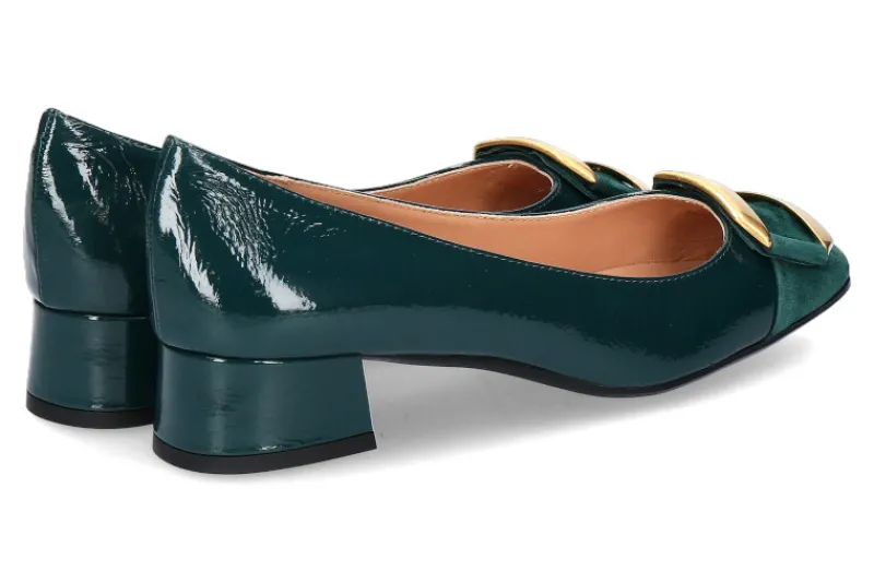 Die Status-Pumps mit einem 30 mm hohen Absatz sind ein Symbol für zeitlose Eleganz und raffinierten Stil. Hergestellt aus flaschenfarbenem Lackleder, verleihen sie jedem Outfit einen Hauch von Luxus und Exklusivität. Die Karree-Form und die glänzende Lackspitze verleihen diesen Schuhen eine klassische und dennoch moderne Note. Ein goldenes Accessoire auf dem Obermaterial verleiht den Pumps eine edle Nuance und betont ihre hochwertige Verarbeitung. Das Lederinnenfutter und die Lederinnensohle bieten nicht nur außergewöhnlichen Tragekomfort, sondern zeugen auch von der Liebe zum Detail, die in jedem Paar steckt. Der Blockabsatz verleiht den Schuhen Stabilität und eine zeitgemäße Silhouette. Diese Status-Pumps sind nicht nur ein modisches Statement, sondern auch ein Zeichen von Geschmack und Stilbewusstsein. Tragen Sie sie bei besonderen Anlässen oder im Alltag, um Ihre Eleganz und Ihren Status zu unterstreichen.
