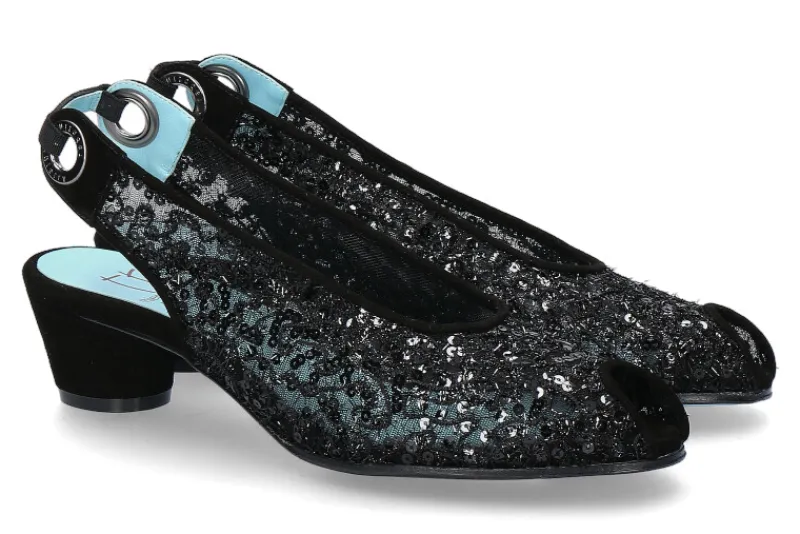 Exklusiv und elegant präsentiert sich die Sandale FIORE aus dem Hause Thierry Rabotin. Glitzernde Pailletten schmücken das Obermaterial aus Gaze, welches den Schuh zusätzliche Eleganz und Esprit beschehrt. Durch einen Elastikeinsatz an der Ferse schmiegt sich die Sandale wunderbar dem Fuss an. Zwei grosse Silberösen werten den Schuh zusätzlich auf. Der feine mit schwarzem Veloursleder überzogene 35 mm Absatz verleiht dem Open-Toe eine angenehme Laufhöhe. Die für Thierry Rabotin typische blaue Ledersohle ist mit einem Gummieinsatz versehen. Handgefertigt werden Schuhe der Marke Thierry Rabotin zu 100% in Italien.