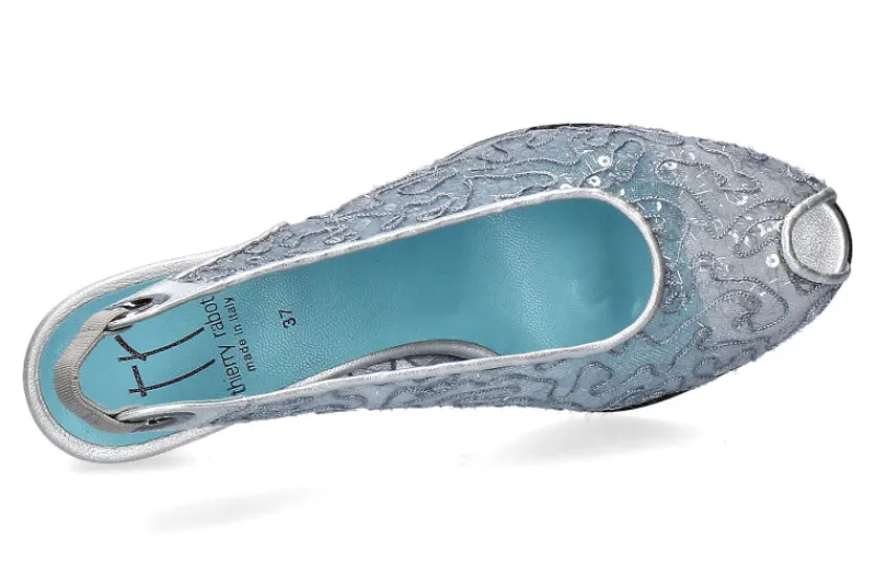 Exklusiv und elegant präsentiert sich die Sandale FIORE aus dem Hause Thierry Rabotin. Glitzernde Pailletten schmücken das Obermaterial aus Gaze, welches den Schuh zusätzliche Eleganz und Esprit beschert. Durch einen Elastikeinsatz an der Ferse schmiegt sich die Sandale wunderbar dem Fuss an. Zwei grosse Silberösen werten den Schuh zusätzlich auf. Der feine mit silbernem Veloursleder überzogene 35 mm Absatz verleiht dem Open-Toe eine angenehme Laufhöhe. Die für Thierry Rabotin typische blaue Ledersohle ist mit einem Gummieinsatz versehen. Handgefertigt werden Schuhe der Marke Thierry Rabotin zu 100% in Italien.
