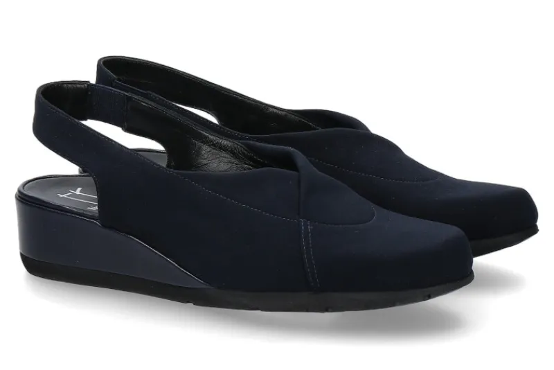 Die Thierry Rabotin Sandale aus weichem Setamaterial in dunkelblau ist ein bequemer Sommerbegleiter. Ein eingesetzter Gummizug am Riemen versichert den perfekten Halt am Fuß. Die Ledersohle sorgt für einen guten Tragekomfort. Der Keilabsatz wurde in Nappaleder gefertigt. Hergestellt werden Schuhe von Thierry Rabotin sehr gut in Italien.