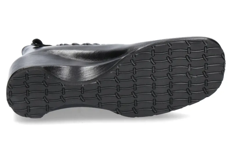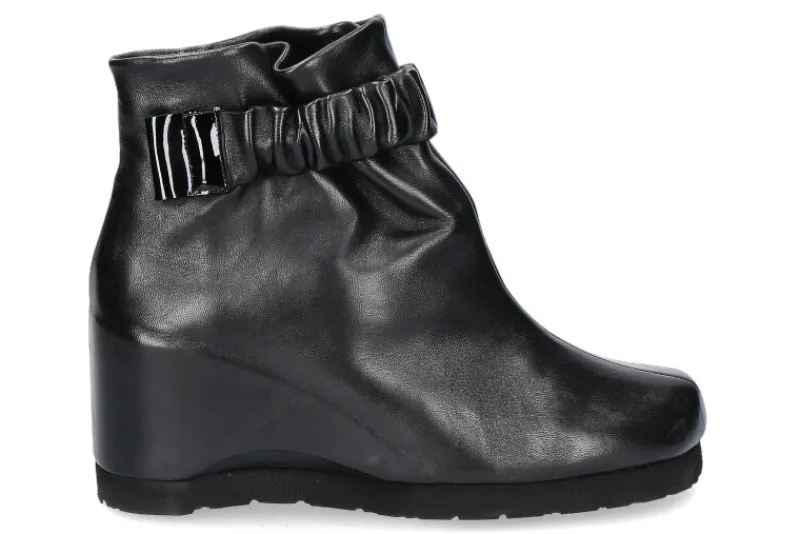 Die Damenstiefelette von Thierry Rabotin aus Nappaleder in schwarz begeistert durch Design. Das Lederband mit integriertem Gummizug verspricht einen stabilen Halt im Schuh. Der verdeckte Keilabsatz, ebenfalls aus Nappaleder beträgt eine Höhe von ca. 80 mm. Innen ist der Schuh mit Leder ausgekleidet. Mit einer profilierten Gummilaufsohle ausgestattet wurde die Thierry Rabotin Stiefelette „ADA“ bestens in Italien hergestellt.