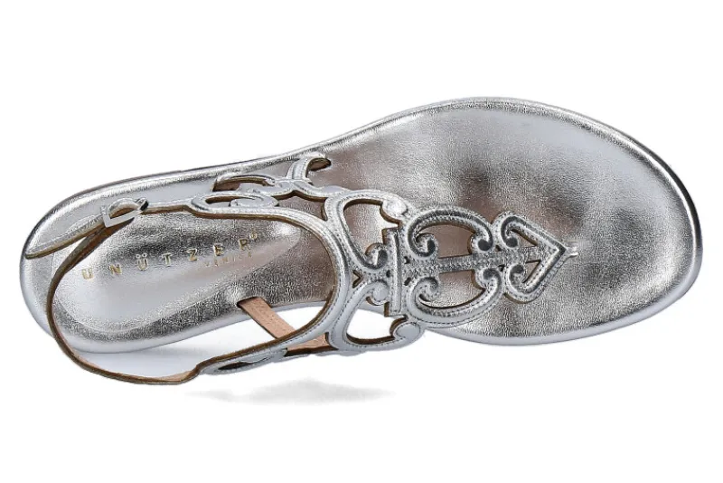 Die elegante Zehentrenner-Sandale von Unützer in metallic silber ist der ideale Sommerschuh. Luftig leicht und elegant ist dieses Modell zugleich. Die tolle Verarbeitung der geschwungenen, filigranen Riemchen macht den Schuh aus Nappaleder einzigartig schön und bequem. Die kleine Schließe lässt das Fersenriemchen individuell in der Länge regulieren. Die angenehme Polsterung aus Leder sorgt für zusätzlichen Komfort. Hergestellt werden Unützer Schuhe in Italien.