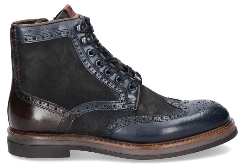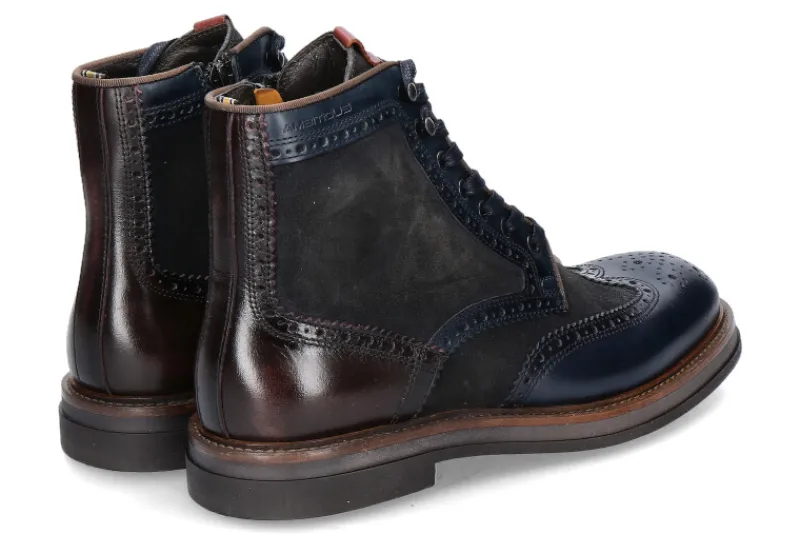 Die Stiefelette von Ambitious für Herren vereint stilvolle Eleganz mit hoher Funktionalität. Hergestellt aus hochwertigem blauem Leder und Nubukleder, bietet sie eine raffinierte Kombination aus modernem Design und traditioneller Handwerkskunst. Die Budapester-Lochung verleiht dem Schuh einen klassischen Touch, während die Schnürung und der seitliche Reißverschluss für optimalen Tragekomfort sorgen. Innen sorgt ein Textilfutter für ein angenehmes Tragegefühl. Die braune Fersenkappe setzt einen eleganten Kontrast zum blauen Obermaterial und verstärkt den Schuh zusätzlich. Diese Stiefelette ist die perfekte Wahl für den modebewussten Mann, der Wert auf Qualität und Stil legt und sich einen vielseitig kombinierbaren Schuh für verschiedene Anlässe wünscht.