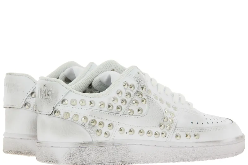 Ein Blickfang ist der Nike Sneaker Customized aus weissem Leder mit Nieten im Used-Look. Das Modell verfügt über eine Textilinnensohle sowie einem gepolsterten Textilfutter. Rutschfest ist die Gummisohle. Der Sneaker wurde in Italien von Hand customized und somit ist jedes Modell ein Unikat.