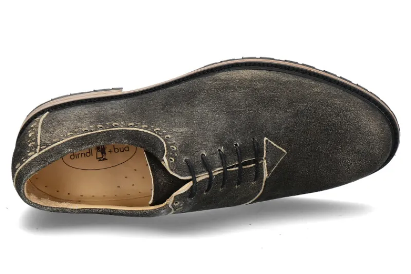 Der feine Trachtenschuh von Dirndl und Bua überzeugt durch bester Verarbeitung und traditionellem Design. Das Obermaterial aus Leder wurde in anthrazit gefertigt. Für den idealen Tragekomfort sorgt die Lederfütterung der Deck- sowie Laufsohle. Die Laufsohle wurde zum Teil mit profiliertem Gummi überzogen um beste Stabilität auf dem Asphalt zu gewähren. Hergestellt werden die Herren Trachtenschuhe von Dirndl + Bua in Italien.