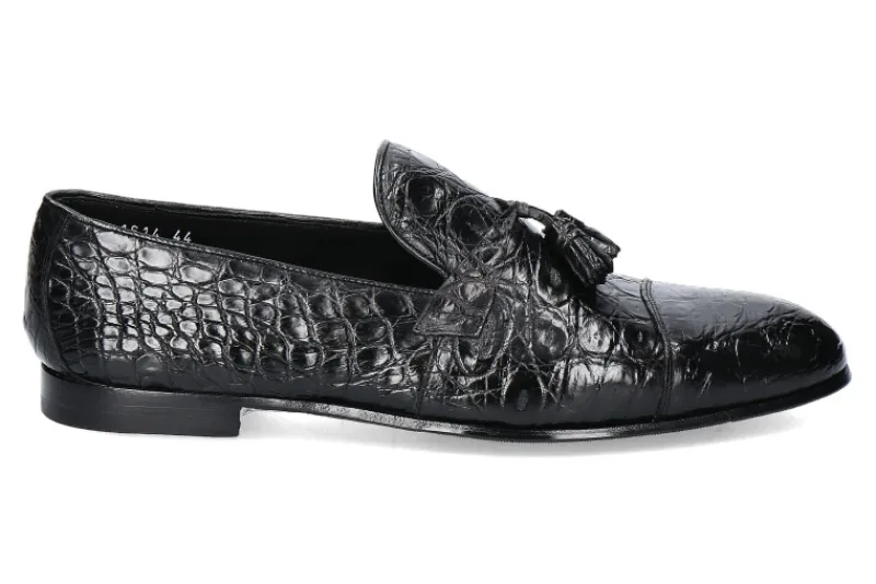 Der luxuriöse Loafer von Doucal’s aus schwarzem Krokodilleder ist ein edler Blickfang für modebewusste Männer. Das klassische Design wird durch zwei Quasten an der Vorderkappe perfekt abgerundet und die schwarze Lederfütterung sorgt für ein angenehmes Tragegefühl. Die Laufsohle aus Leder mit Gummianteil gewährleistet guten Grip auf dem Asphalt. Hergestellt in Italien, ist der Loafer ein Meisterwerk der Handwerkskunst mit hoher Haltbarkeit. Ob für den täglichen Gebrauch im Büro oder für besondere Anlässe, der Schuh lässt sich perfekt mit Anzügen, Chinos oder Jeans kombinieren und ist somit ein vielseitiger Schuh für jeden Anlass. Investition in Stil und Qualität, der Doucal’s Loafer ist ein Statement für den Träger und ein praktisches Accessoire für den Alltag.