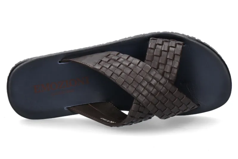 Die Emozioni Herren Pantolette in dunkelbraun wurde aus geflochtenem Leder gefertigt. Durch die weiche Decksohle und die angenehm gepolsterte Fütterung ist Ihnen ein angenehmes Laufgefühl sicher. Die Gummisohle ist sehr flexibel und weich. MADE IN ITALY!