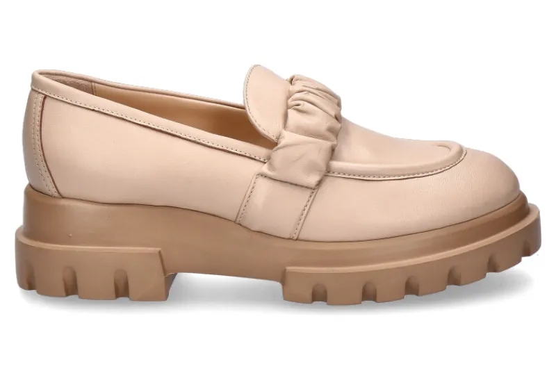 Modisch ein absolutes Must-have der Saison. Der Loafer mit Chunky Sohle von AGL in einem warmen Puder ton lässt sich perfekt kombinieren. Die Schuhe aus Leder sind mit einem gerafften Lederriemen am Oberteil verziert. Innen ist der Schuh komplett mit Leder ausgestattet. Der Absatz mit einer Höhe von 55mm ermöglicht einen angenehmen Tragekomfort. Der Schuh wurde unter den höchsten Qualitätsanforderungen in Italien hergestellt.