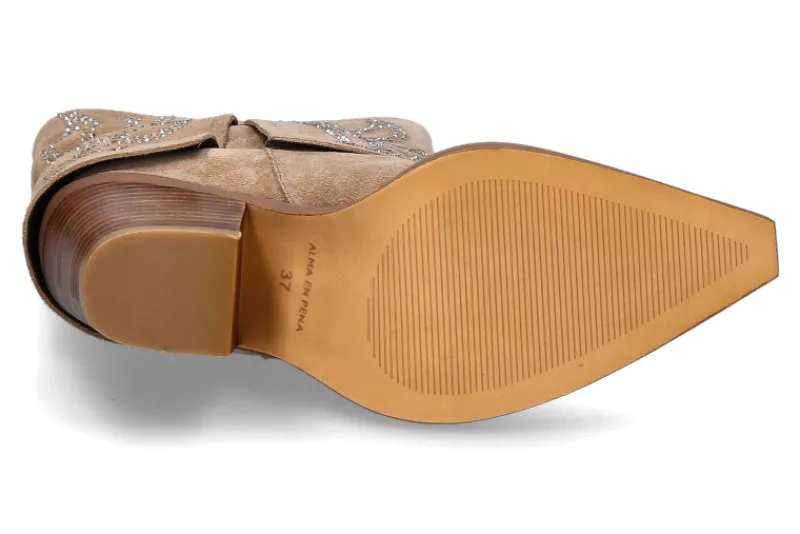 Die Alma en Pena Cowboy Boots präsentieren sich in beigem Veloursleder und sind am Schaft mit funkelnden Strasssteinen verziert. Ein markanter 70 mm Absatz verleiht dem Schuh eine elegante Höhe und betont die Western-Ästhetik. Das weiche Fleecefutter sorgt für Wärme und Tragekomfort, während die robuste Synthetiksohle für Stabilität und Halt sorgt. Die spitz zulaufende Form verleiht den Boots eine klassische Cowboy-Optik. Diese Stiefel vereinen Stil und Funktionalität und sind perfekt für mutige Fashion-Statements geeignet. Die Verbindung von hochwertigem Material und funkelnden Details macht sie zu einem Blickfang in jeder Garderobe, und ihre vielseitige Tragbarkeit lässt sie sowohl im Alltag als auch zu besonderen Anlässen glänzen.
