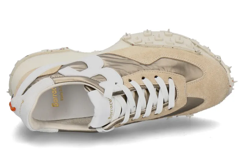 Die Barracuda Damen-Sneaker aus Veloursleder und Nylon in den eleganten Farben Cappuccino, Champagner und Weiß bieten nicht nur ein modernes Design, sondern auch hohen Tragekomfort. Die Frotteefütterung sorgt für eine angenehme Frische, während die Lederdecksohle für zusätzlichen Komfort sorgt. Die sportive Gummisohle mit Noppen bietet hervorragenden Halt und Dämpfung, sodass der Sneaker sowohl für den Alltag als auch für sportliche Aktivitäten bestens geeignet ist. Die Kombination aus stilvollem Veloursleder und robustem Nylon macht den Schuh besonders widerstandsfähig und zugleich modisch. Ein vielseitiger Sneaker, der sowohl funktional als auch optisch überzeugt – perfekt für aktive Damen, die auf Stil und Komfort nicht verzichten möchten.